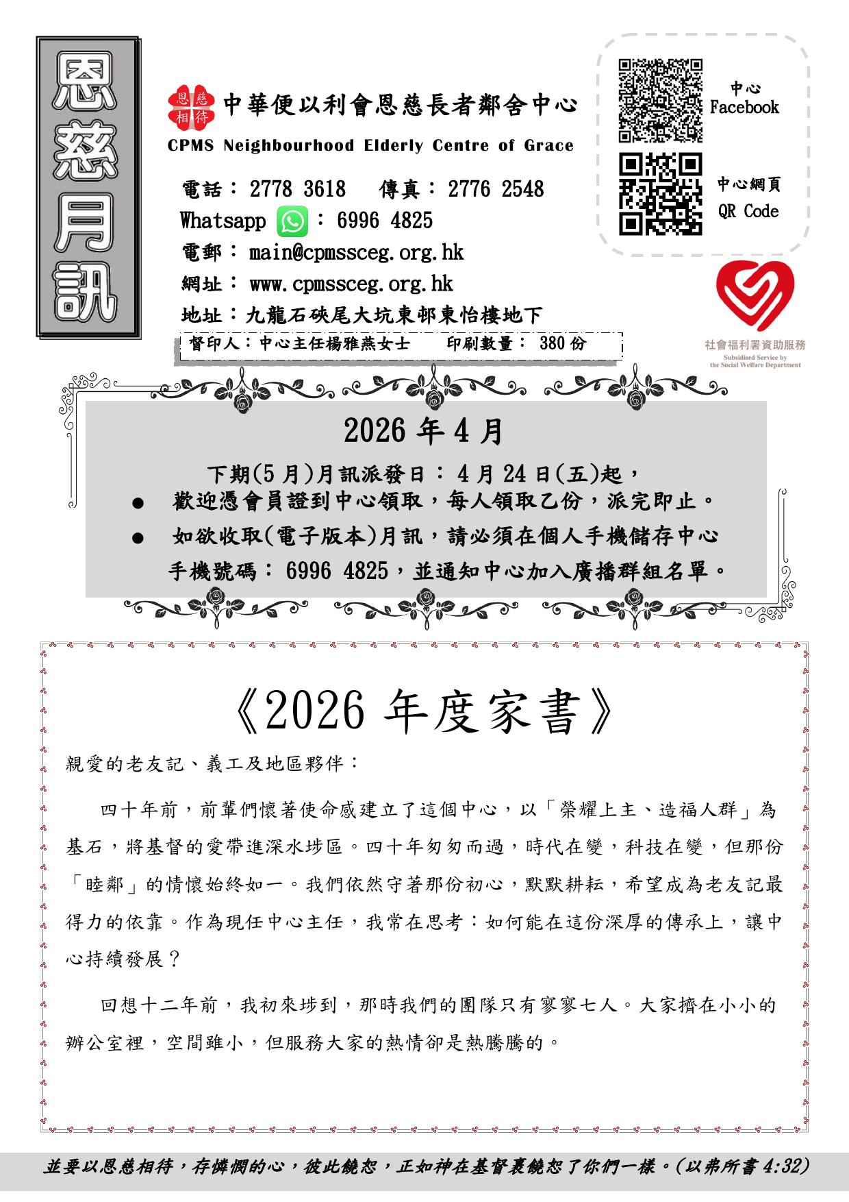 中心最新消息及活動 2026年4月訊及活動2026年3月訊及活動 2026年4月A3內頁版 2026年3月A3內頁版 「並要以恩慈相待,存憐憫的心,彼此饒恕,正如神在基督裏饒恕了您們一樣。」(以弗所書4:32)